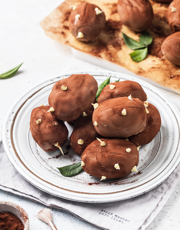 2. Достаньте из морозилки заготовки, нанизывайте на деревянную шпажку и окунайте в глазурь. Излишки стряхивайте и выкладывайте готовые картошки обратно на доску.