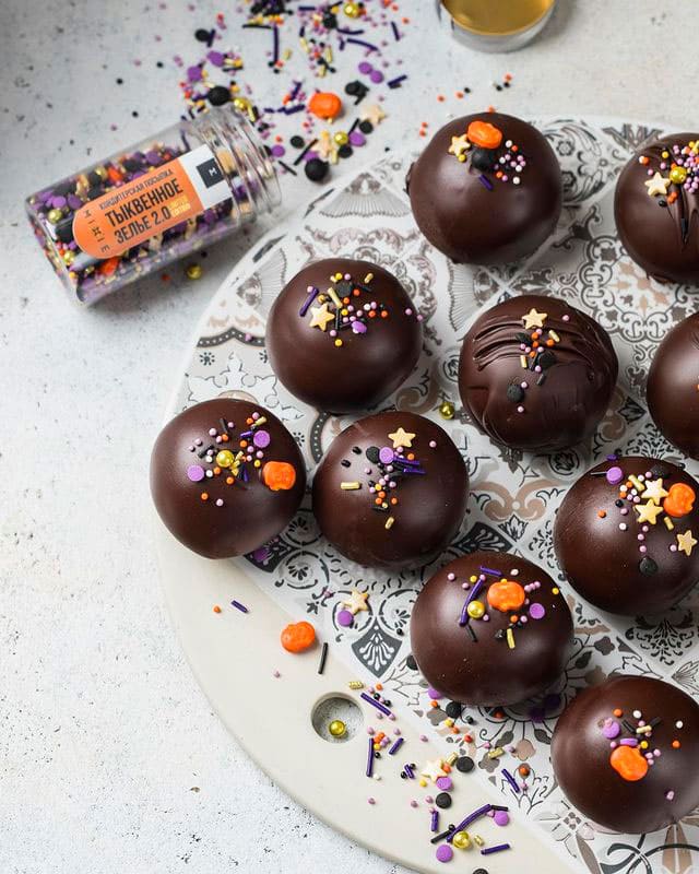 2. Замерзшие тыквенные шарики окуните в глазурь, быстро стряхните излишки, выложите на пергамент и украсьте фирменной посыпкой MIXIE «Тыквенное зелье 2.0».